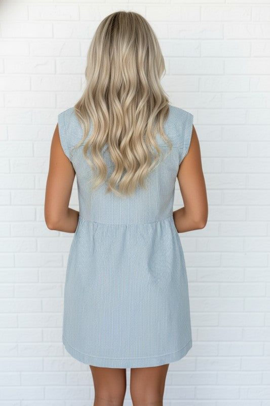 Stripe Denim Collared Buttoned Sleeveless Dress