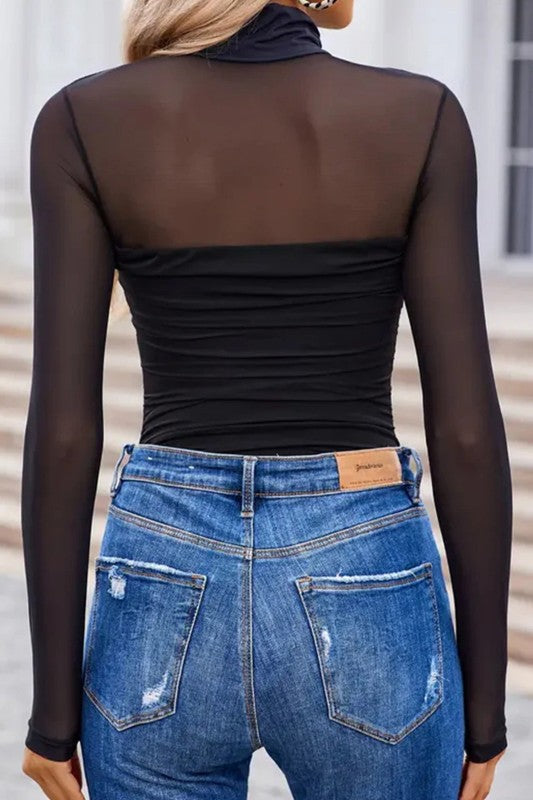 Sheer Mesh Patchwork High Neck Long Sleeve Top
