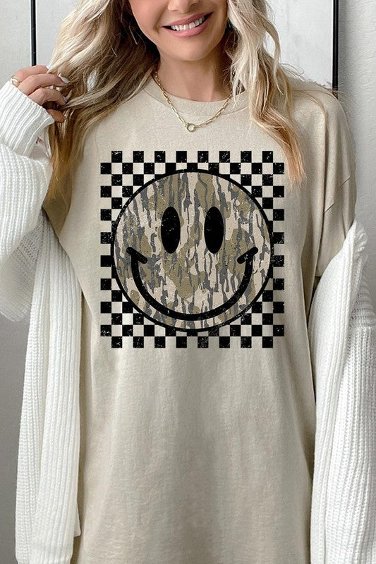 Retro Camo Smiley Face Graphic Heavy Cotton Tee
